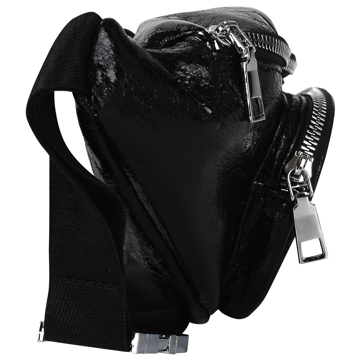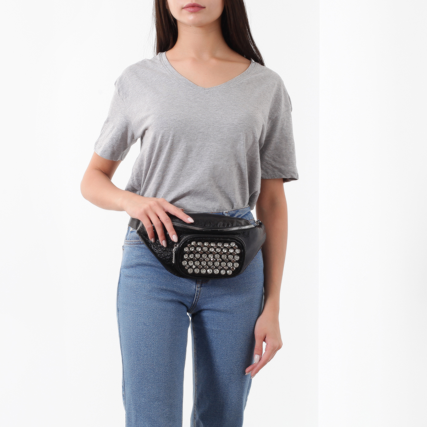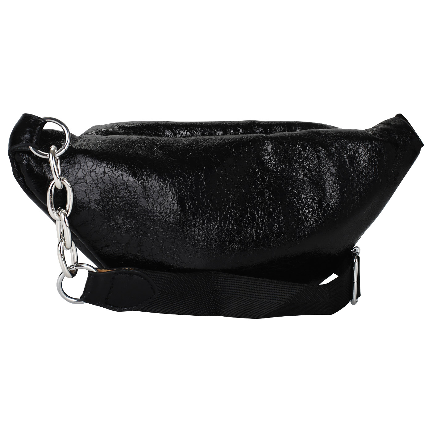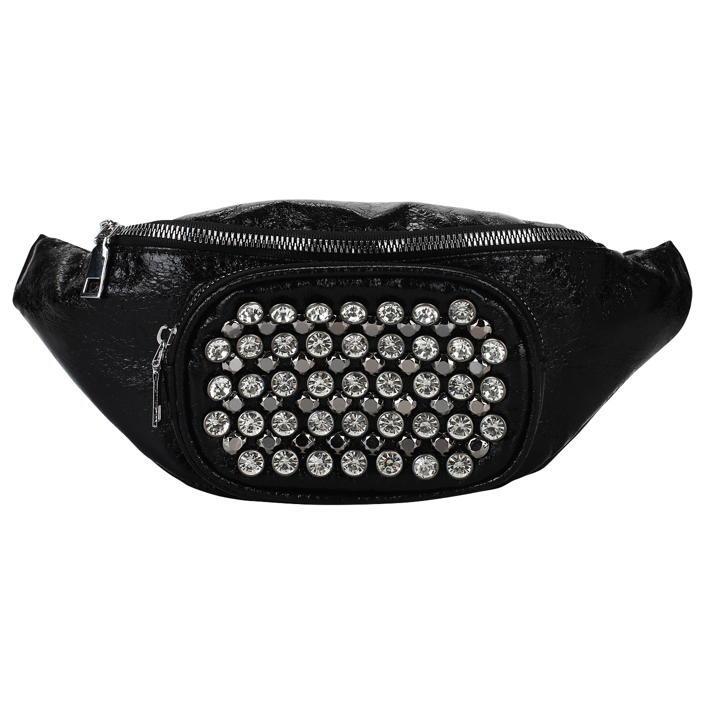 Вместительная поясная сумка с ламинацией и стразами послужит стильным дополнением к повседневному образу и не менее эффектно дополнит выходной наряд. Черная модель на молнии изготовлена из гипоаллергенной, прочной, устойчивой к перепаду температур экокожи. К передней стенке снаружи примыкает карман на молнии. Длина дополненного цепочкой поясного ремня регулируется.